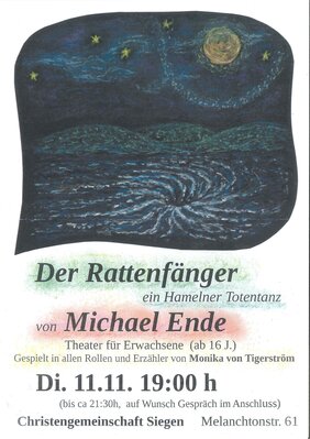 Frau Monika von Tigerström hat dieses Werk von Michael Ende zum Solostück umgearbeitet und spielt es sehr differenziert in 7 Charakterrollen (Bürgermeister, Vogt, Abt, Bürgermeisterfrau, Tochter 14 J., lahmes Bettelmädchen und den angeklagten Seher, dazu armes Volk, Landsknechte und den Spielmann als stumme Rolle mit der Flöte. Sie hat eine Sprachgestaltung- und Schauspielausbildung und die Fähigkeit, sich in die verschiedensten Rollen zu verwandeln. Das Stück dauert mit Pausen 2,1/2 Stunden.