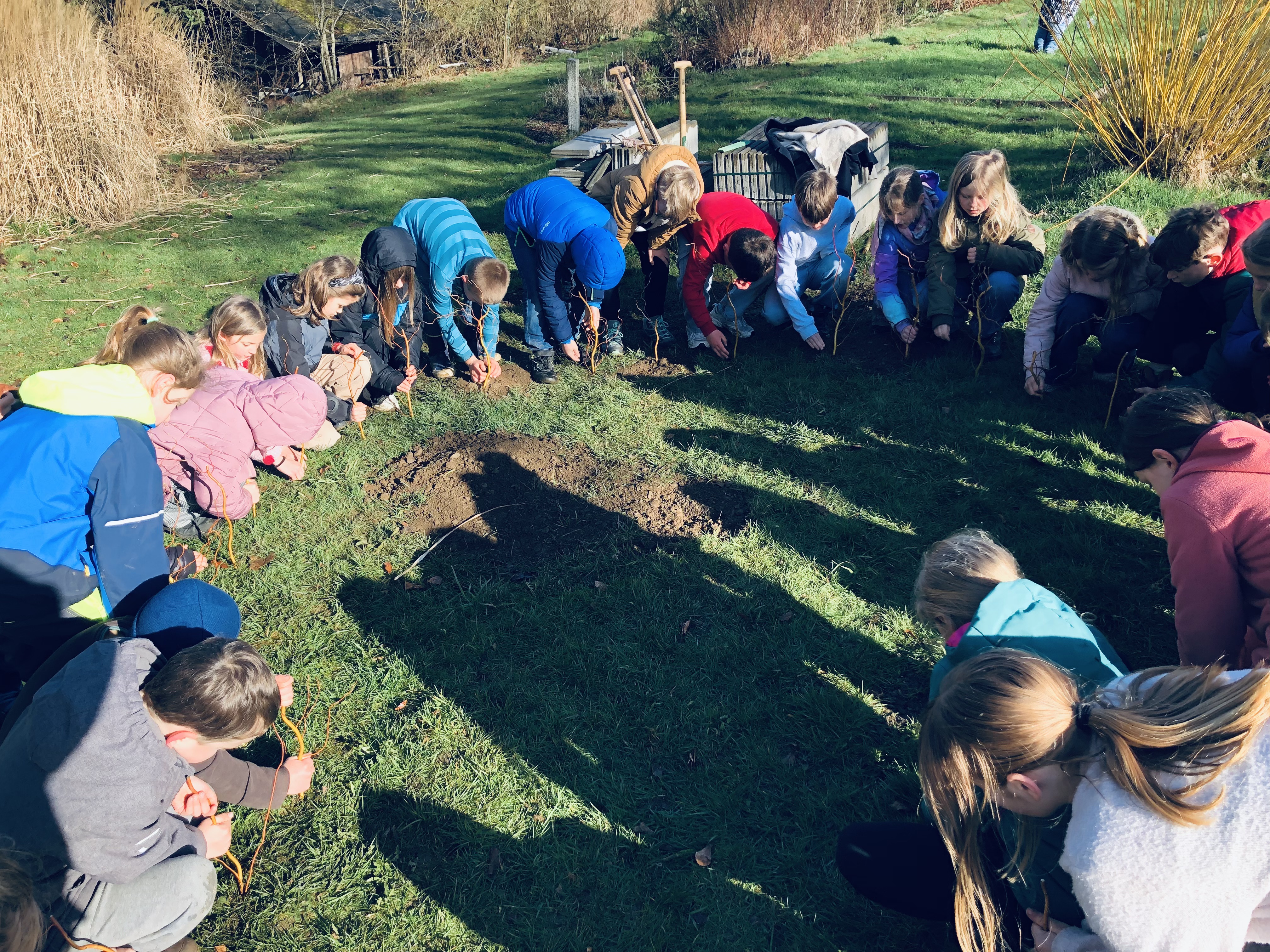 Mit einem zukunftsorientierten Bauprojekt hat die 3. Klasse (Hasen) die Hausbauepoche feierlich abgeschlossen: Im Schulgarten wurde ein Weidenhaus gepflanzt! Noch stehen die einzelnen Weidenruten nebeneinander, doch ihr Wachstum ist bereits angelegt. In den kommenden Wochen treiben sie aus, neue Zweige und Blätter bilden sich, die einzelnen Ruten beginnen sich miteinander zu verbinden und zusammenzuwachsen. Sie werden dann verflochten und bilden irgendwann ein Dach, dass gemeinsam einen Innenraum schützt - das Weidenhaus.