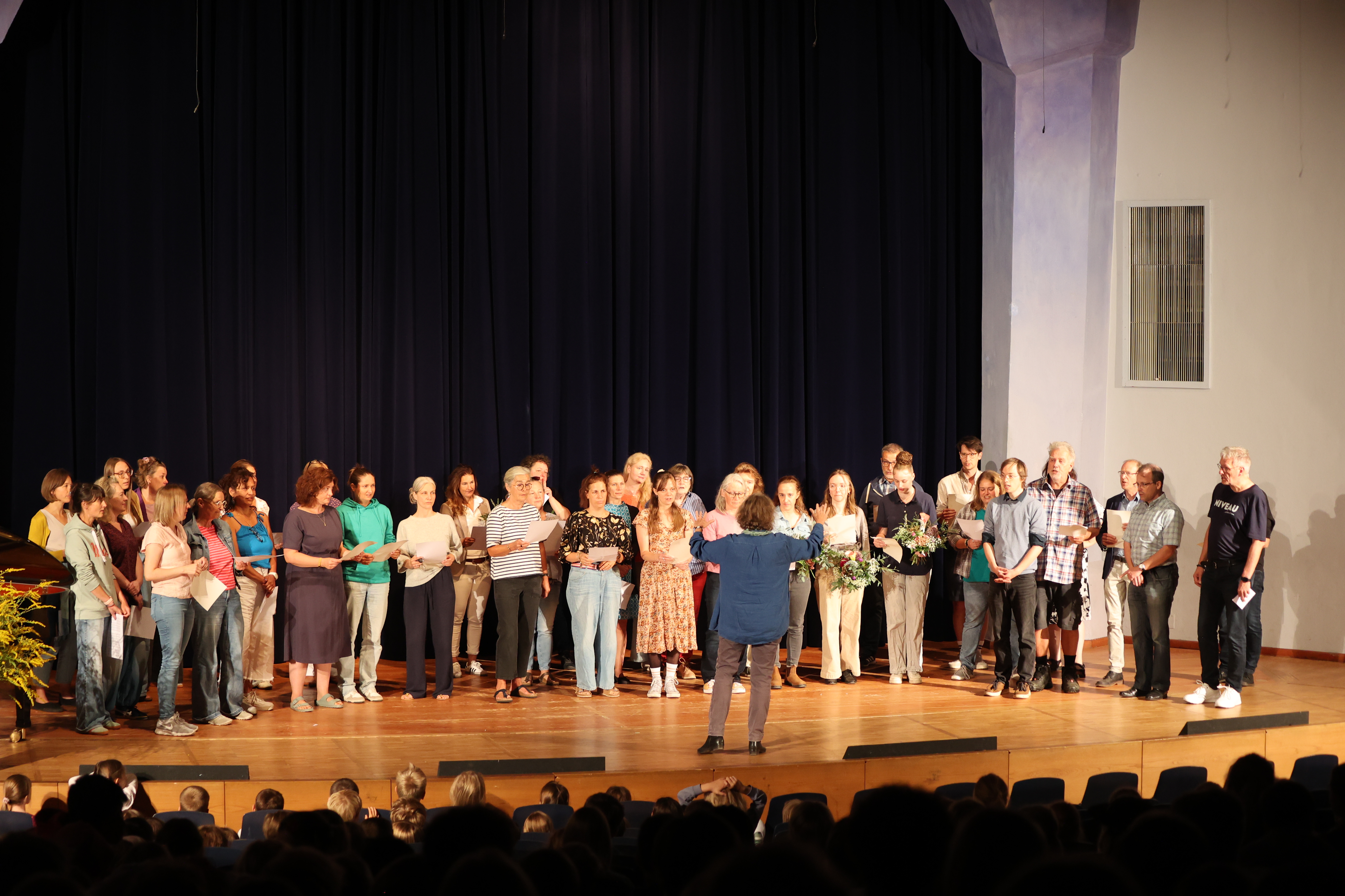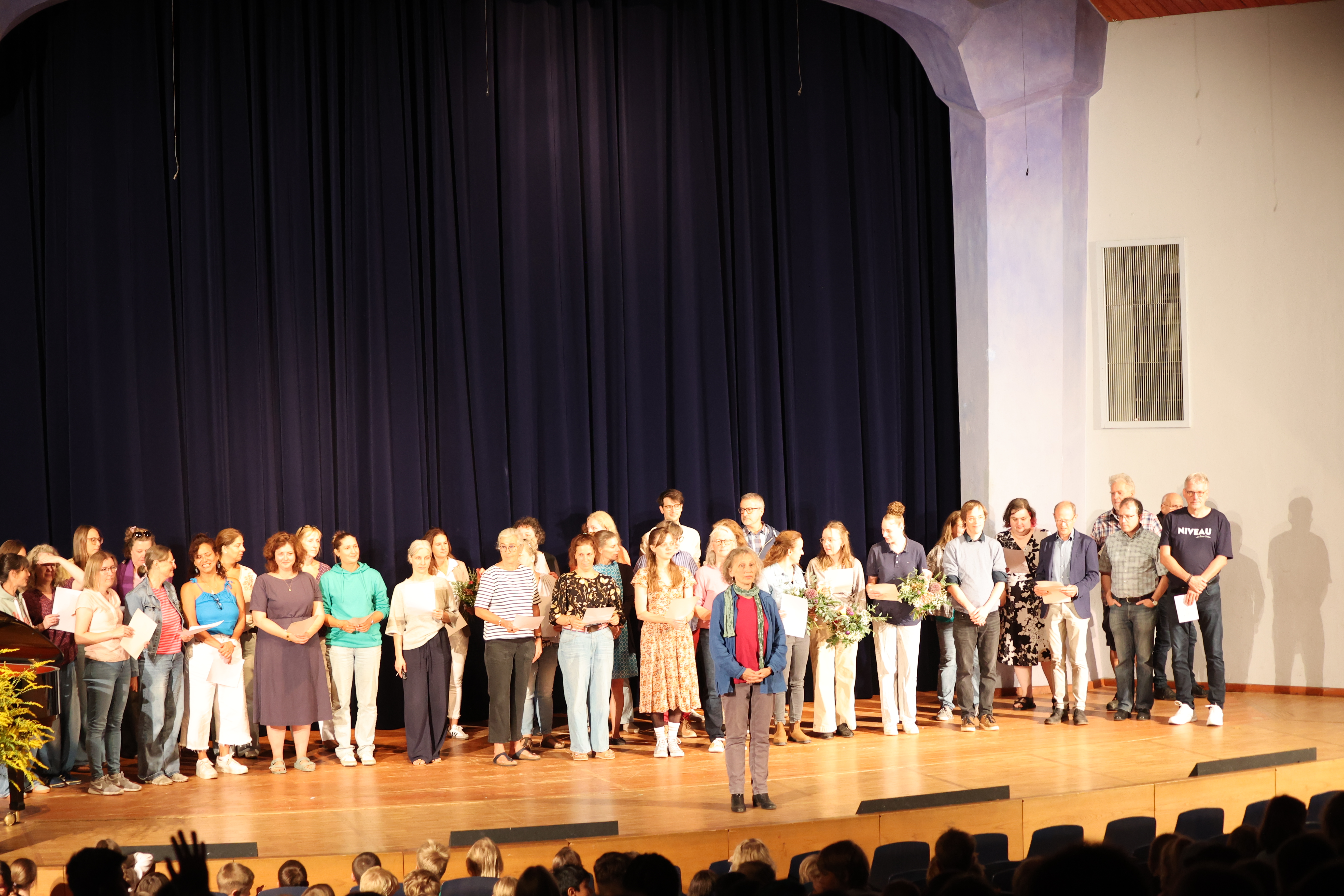 Für eine halbe Stunde trafen sich alle Klasse heute um 9 Uhr zur Anfangsfeier, wo der neue pädagogische Rat mit zwei kurzweiligen Ansprachen Impulse in alle Klassen gab, die neuen Kolleginnen vorgestellt wurde und das gesamte Kollegium ein dreistimmiges Lied zur Begrüßung sang. Vorher und nachher hatten die Klassenlehrer und Klassenbetreuer Zeit, mit Ihren Klassen den Einstieg in das neue Schuljahr zu gestalten. Morgen werden wir mit der Einschulung unserer neuen Klasse 1 (30 Schüler) dann wieder komplett sein.