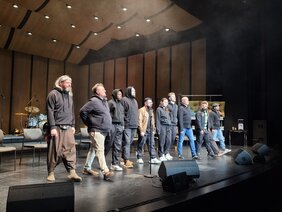Auch die angekündigte Unwetterwarnung hat am gestrigen Donnerstagabend den größten Teil der 12. Klasse und die beiden Klassenbetreuer Matussek und Albe-Nolting nicht vom Besuch des obigen Theaterstückes abhalten können. Und es hat sich wirklich gelohnt. Hochaktuell, hervorragend gespielt mit ganz viel Emotionen, direkt und ehrlich, dabei die Schauspieler auch hervorvorragende Sänger und Instrumentalisten in einem - es war ein bewegender Theaterabend. Wer noch die Chance hat, die weiteren Aufführungen zu sehen, sollte es unbedingt wahrnehmen.