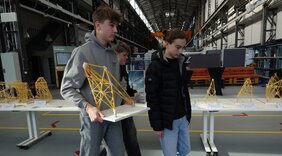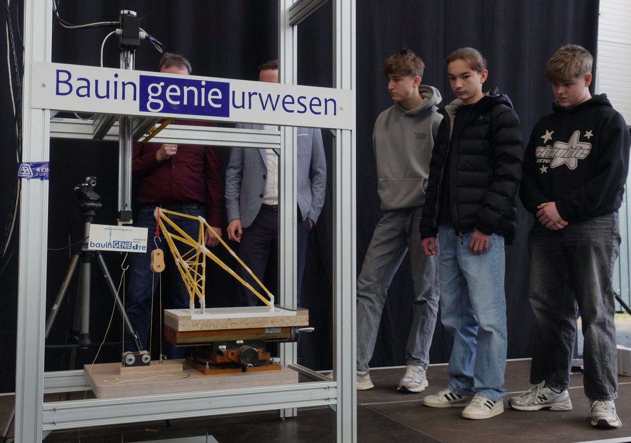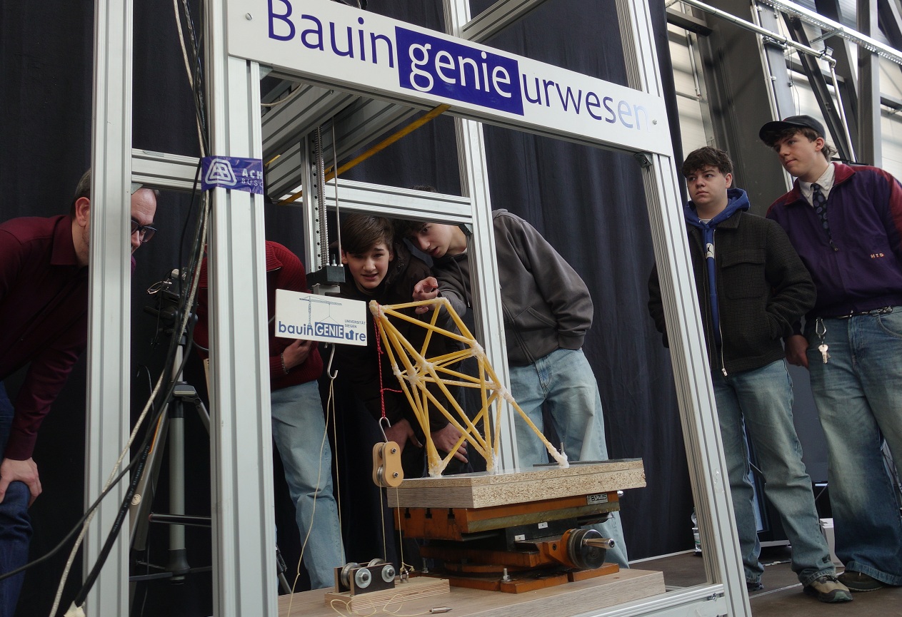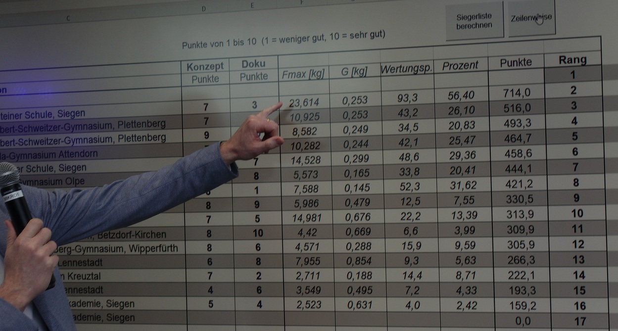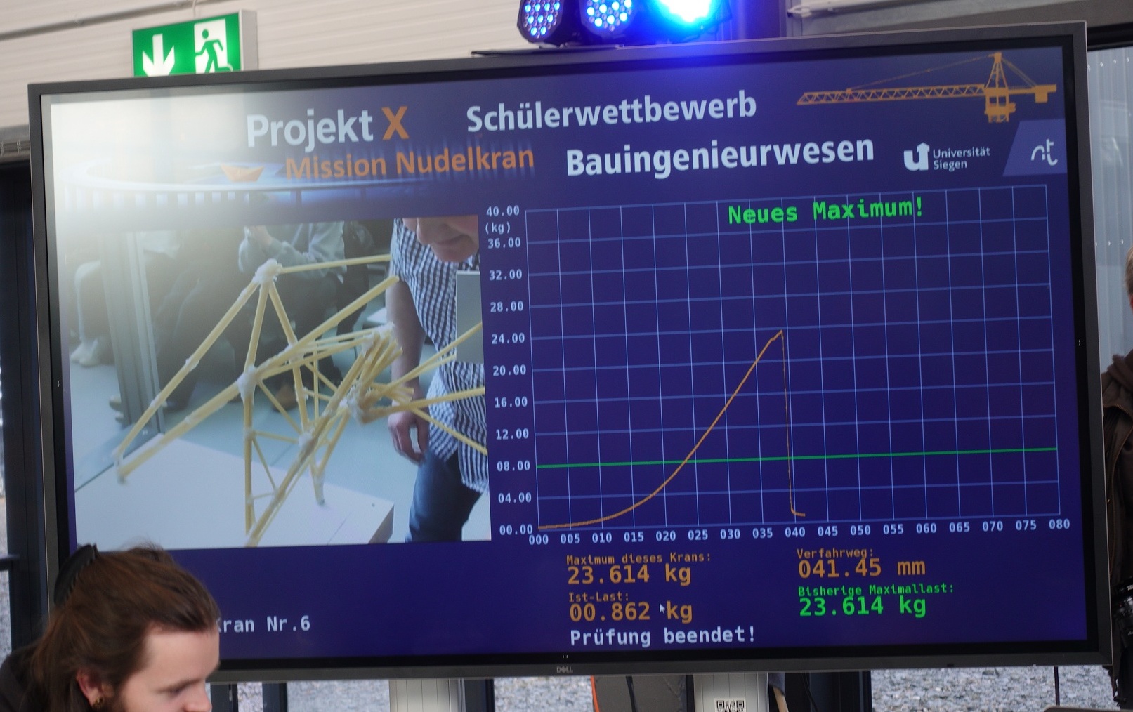 Der Wettbewerb fand in der großen Fabrikhalle der Uni, auf dem Campus Buschhütten statt. Hier war es für uns natürlich spannend, auch die Kräne der anderen Teilnehmergruppen in ihrer Vielfalt und Leistung zu erleben! In einer Testvorrichtung mit Verfahrzylinder und Umlenkrollen wurde jeder Kran bis auf's Äußerste getestet. An der Anzeigentafel konnte man genau mitverfolgen, wie die Belastung ansteigt und wann die ersten Brüche auftraten. Wir kamen als fünfte Gruppe dran – und hatten die Spitzenbelastung von 23,614 kg, die während des ganzen Wettbewerbs nicht mehr übertroffen wurde! Spannend blieb also nur, ob ein anderer Kran ein besseres Verhältnis von Eigengewicht zu Traglast erreichen würde... Das war tatsächlich bei einem einzigen Leichtbau-Modell der Fall. Aber der zweite Platz von insgesamt 17 Gruppen aus 11 Schulen war unserer!