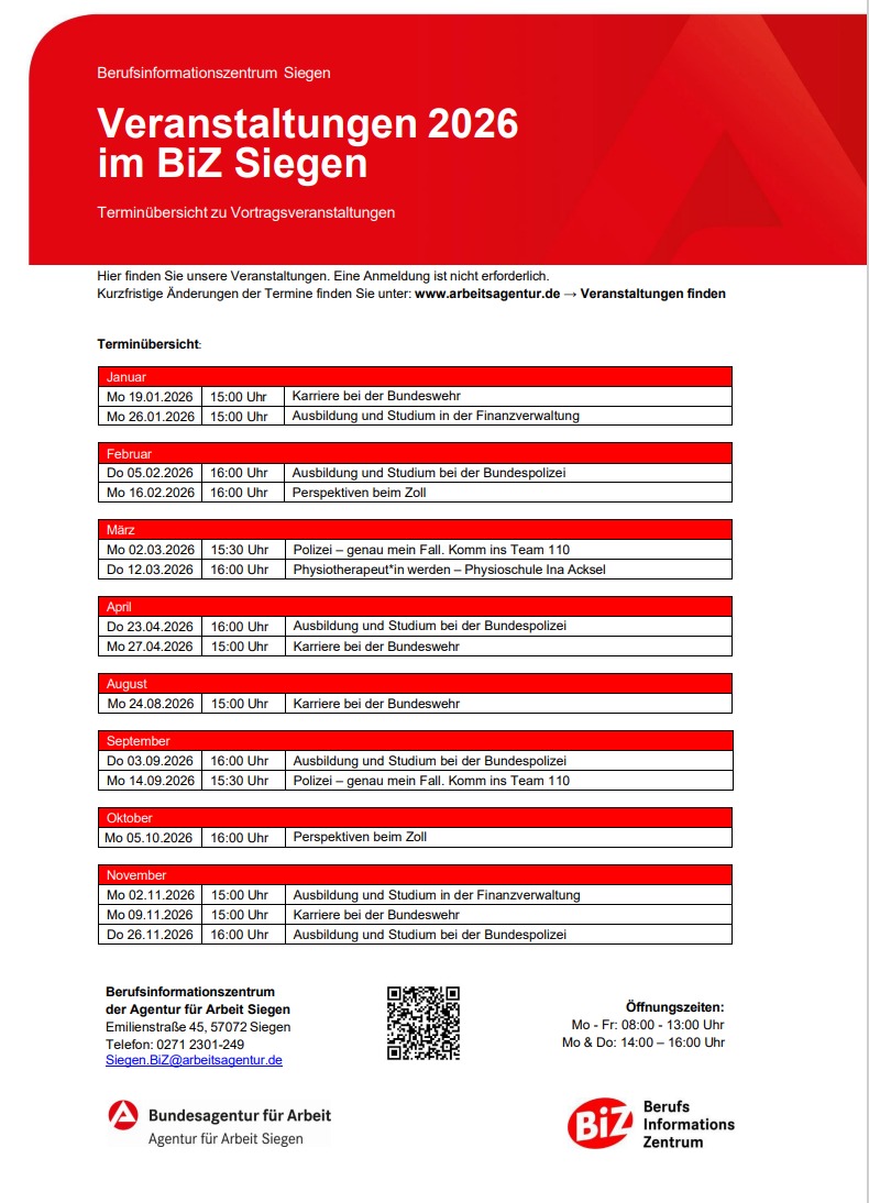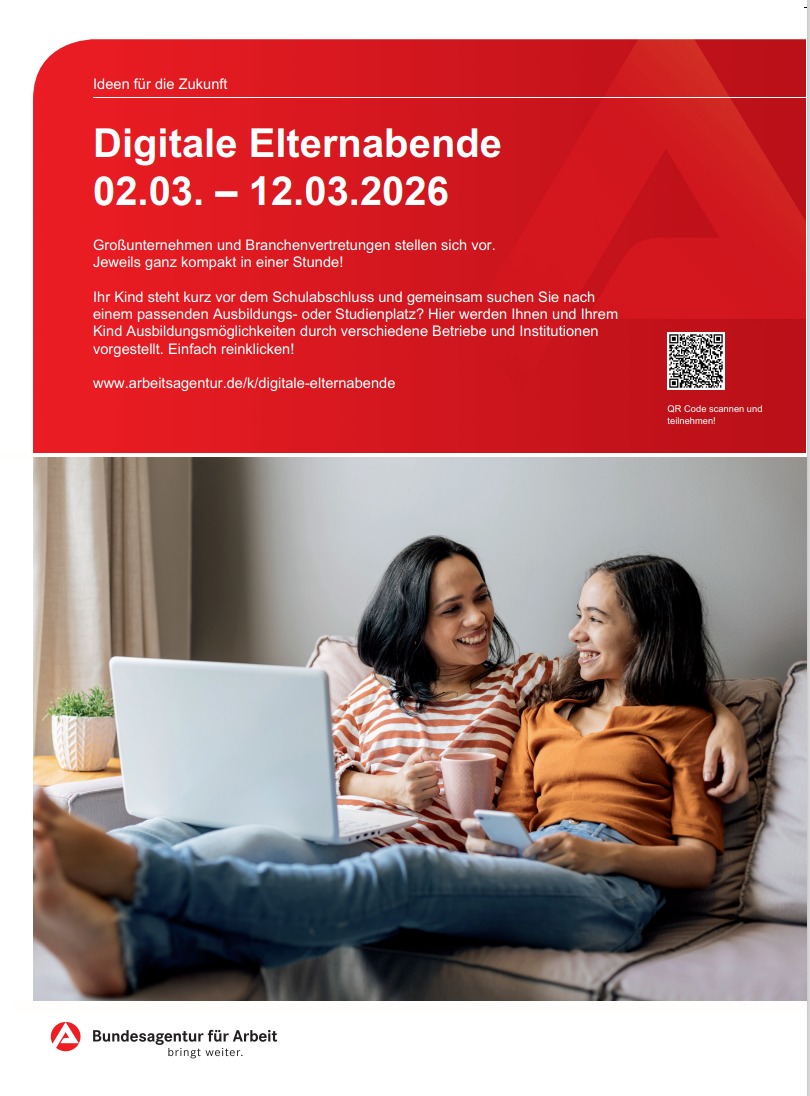 Die digitalen Elternabende Digitale Elternabende: Unternehmen informieren zu Ihren Ausbildungen | Bundesagentur für Arbeit vom 2.-12. März und die Reihe des BIZ von Januar bis November. Näheres dazu auch hier Siegen - Suchübersicht - Bundesagentur für Arbeit - Veranstaltungen