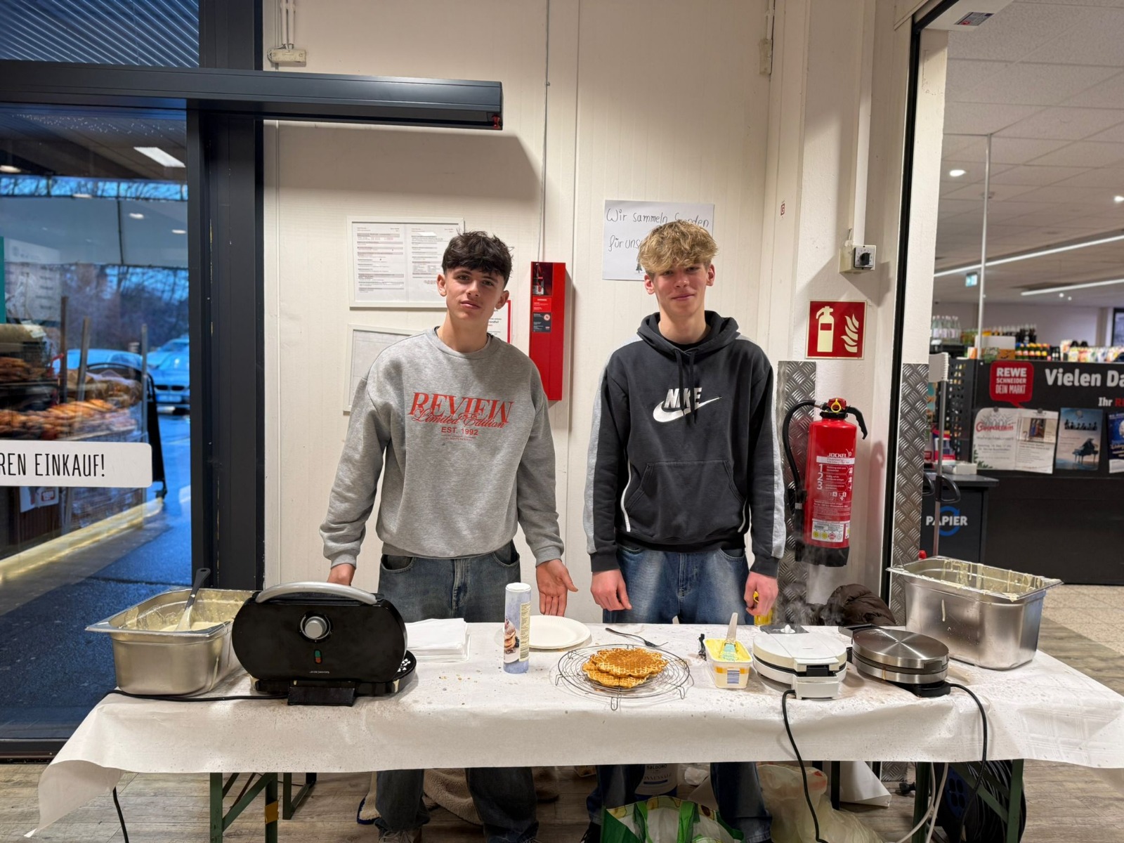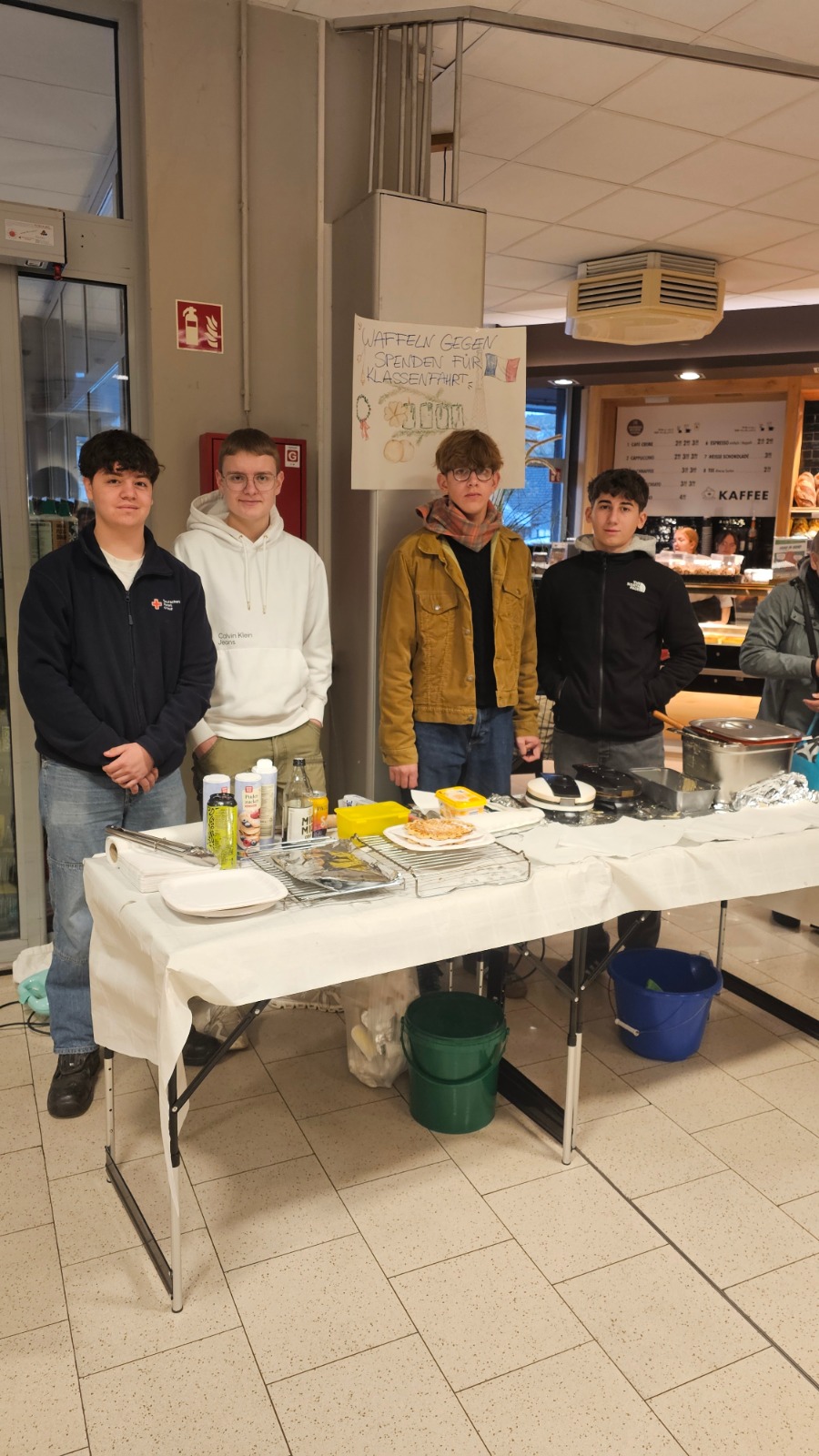 Die jetzige 12. Klasse hatte im letzten Jahr den Aufschlag gemacht - die jetzige 11. Klasse wiederholte das erfolgreich. Auch sie verkauften in drei Rewemärkten selbstgebackene Waffeln, um noch Geld für ihre Kunstfahrt nach Paris einzunehmen. Die Zutaten wurden wiederum von Rewe gespendet - herzlichen Dank an Helen Adams!! - und mit gut 1300 Euro wurde gut etwas eingenommen.